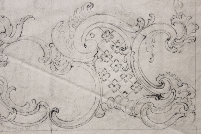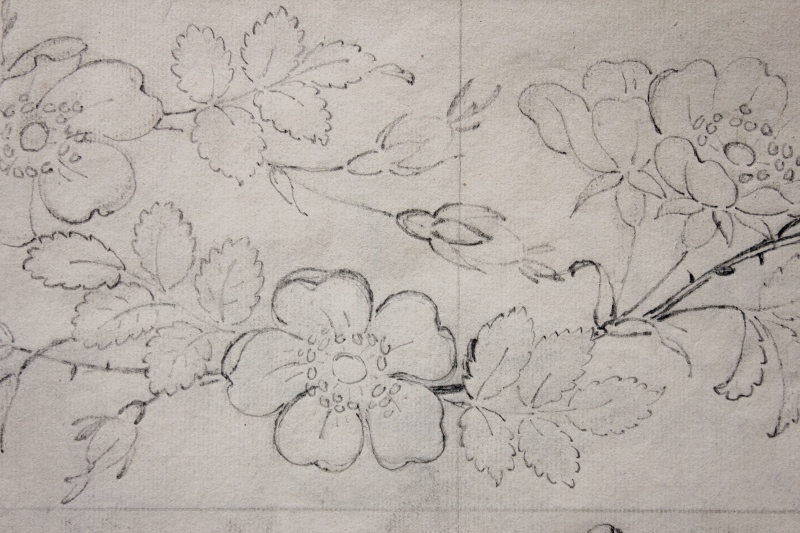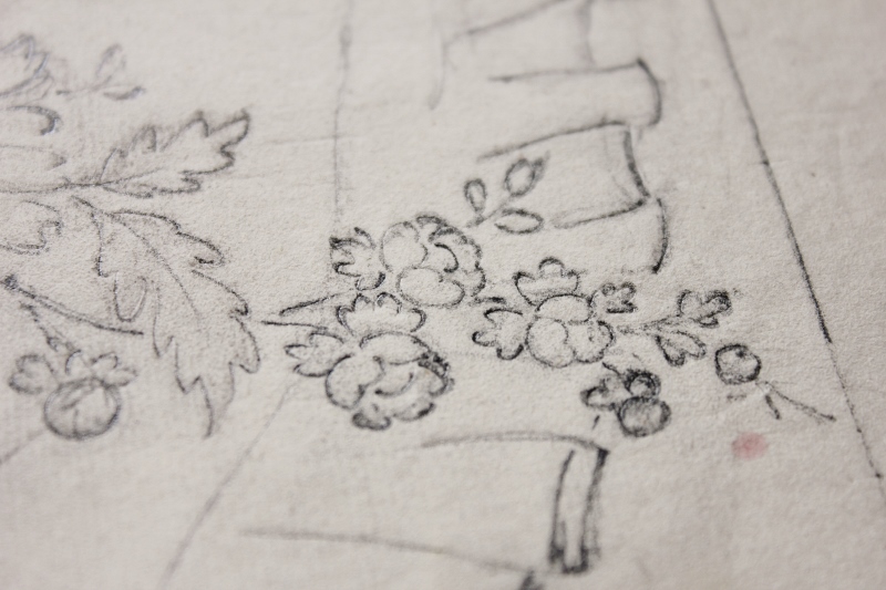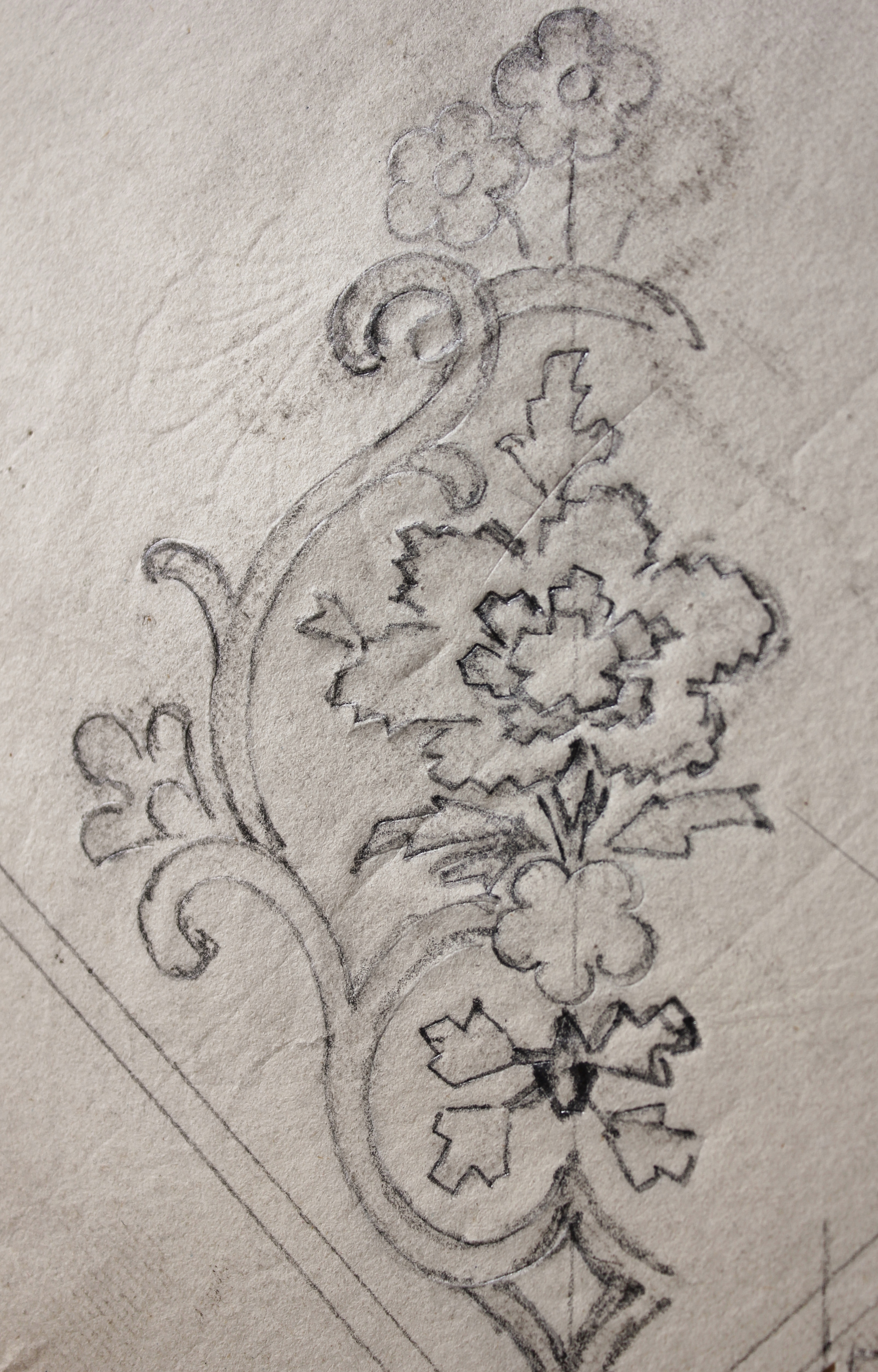Joli trésor de brocante bourguignonne. J’ai eu un coup de foudre il y a quelques années pour ces planches de dessin entassées par dizaines dans un vieux carton au fond de la boutique d’une antiquaire. Je n’ai pas osé en prendre plus de quatre feuillets, mais si j’avais été moins timorée j’aurais tout emporté… Comme pour la broderie, et tous les travaux minutieux, je suis fascinée à l’idée de cette main méticuleuse et soignée qui à dû passer des heures à calculer la dimension de ses motifs afin qu’ils s’entrelacent sans heurt à l’infini. Selon l’antiquaire, ces feuillets auraient été dessinés par un membre de sa famille au début du XXe siècle pour une manufacture de papier peint normande. Légende ou non, je les trouve magnifiques et ne me lasse pas de les contempler !8