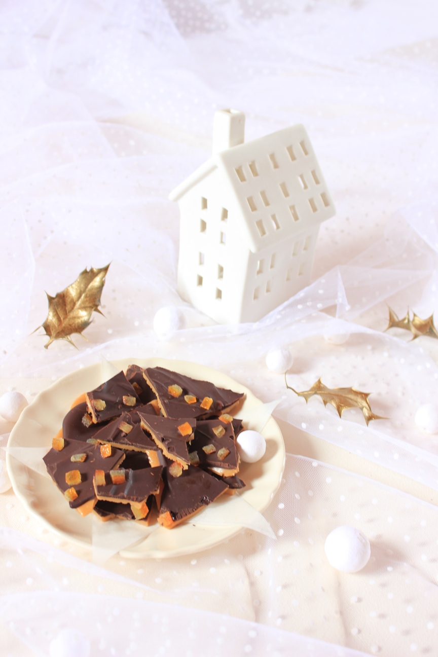 Éclats de caramel, chocolat et écorces d’oranges confites