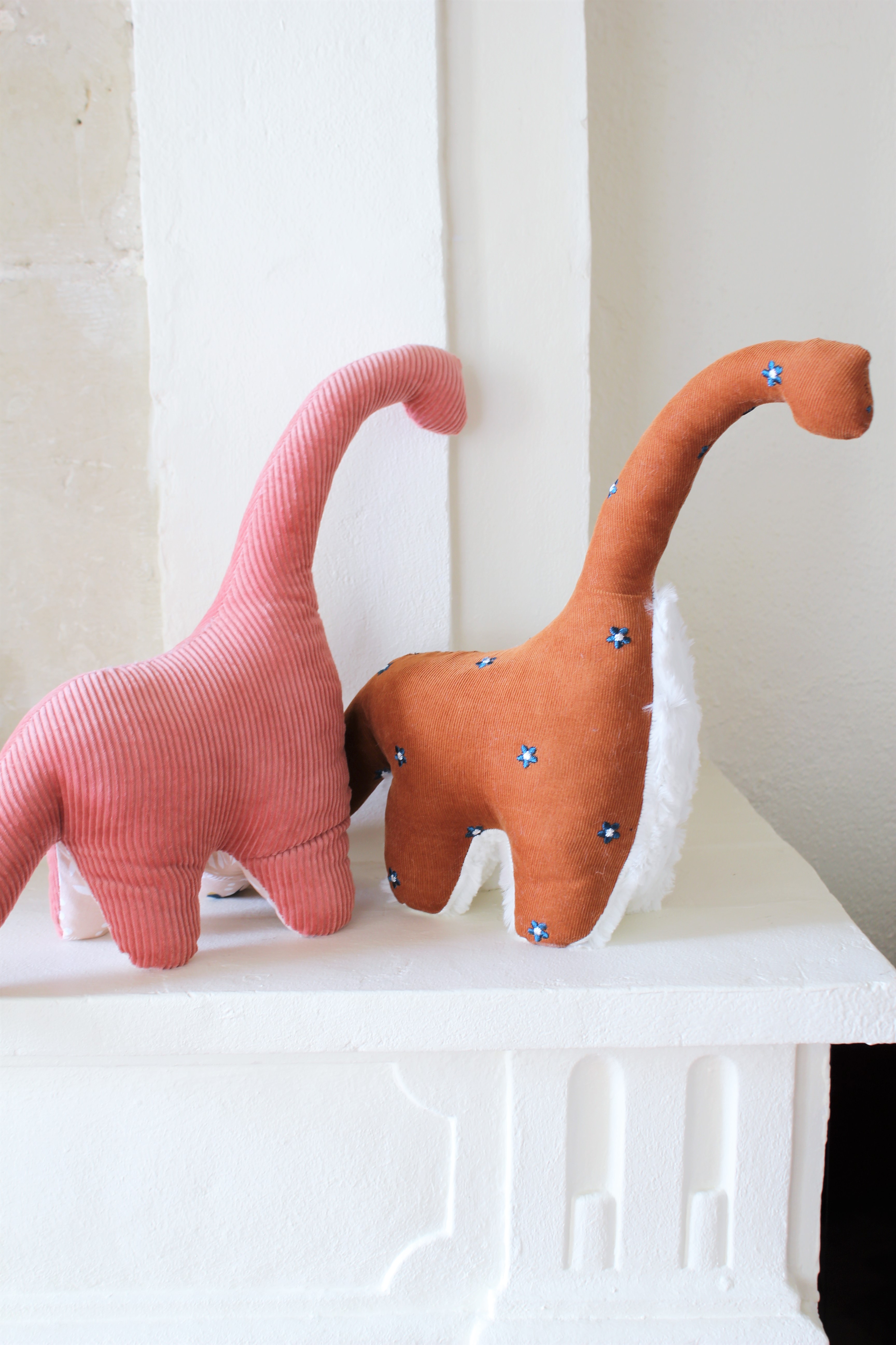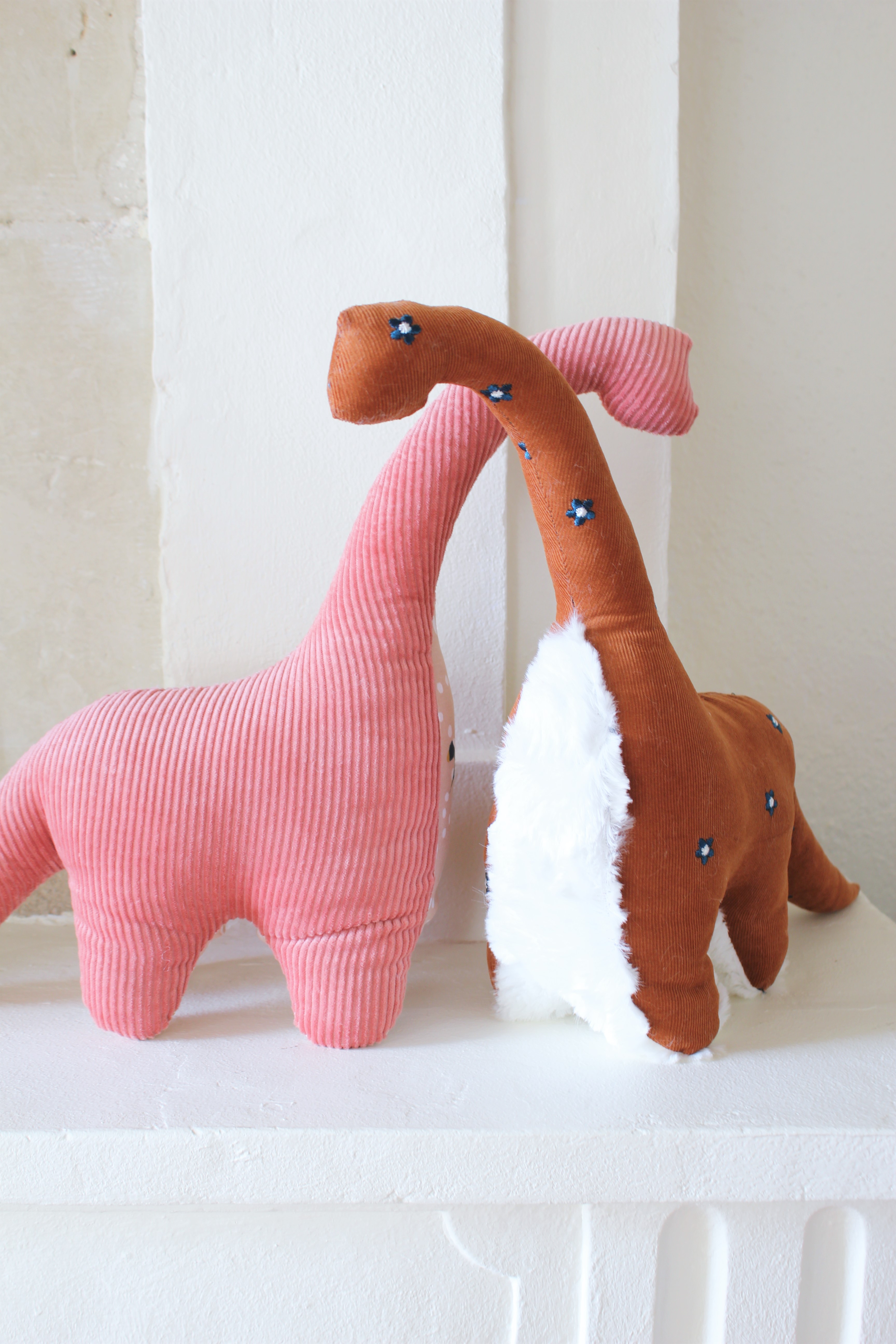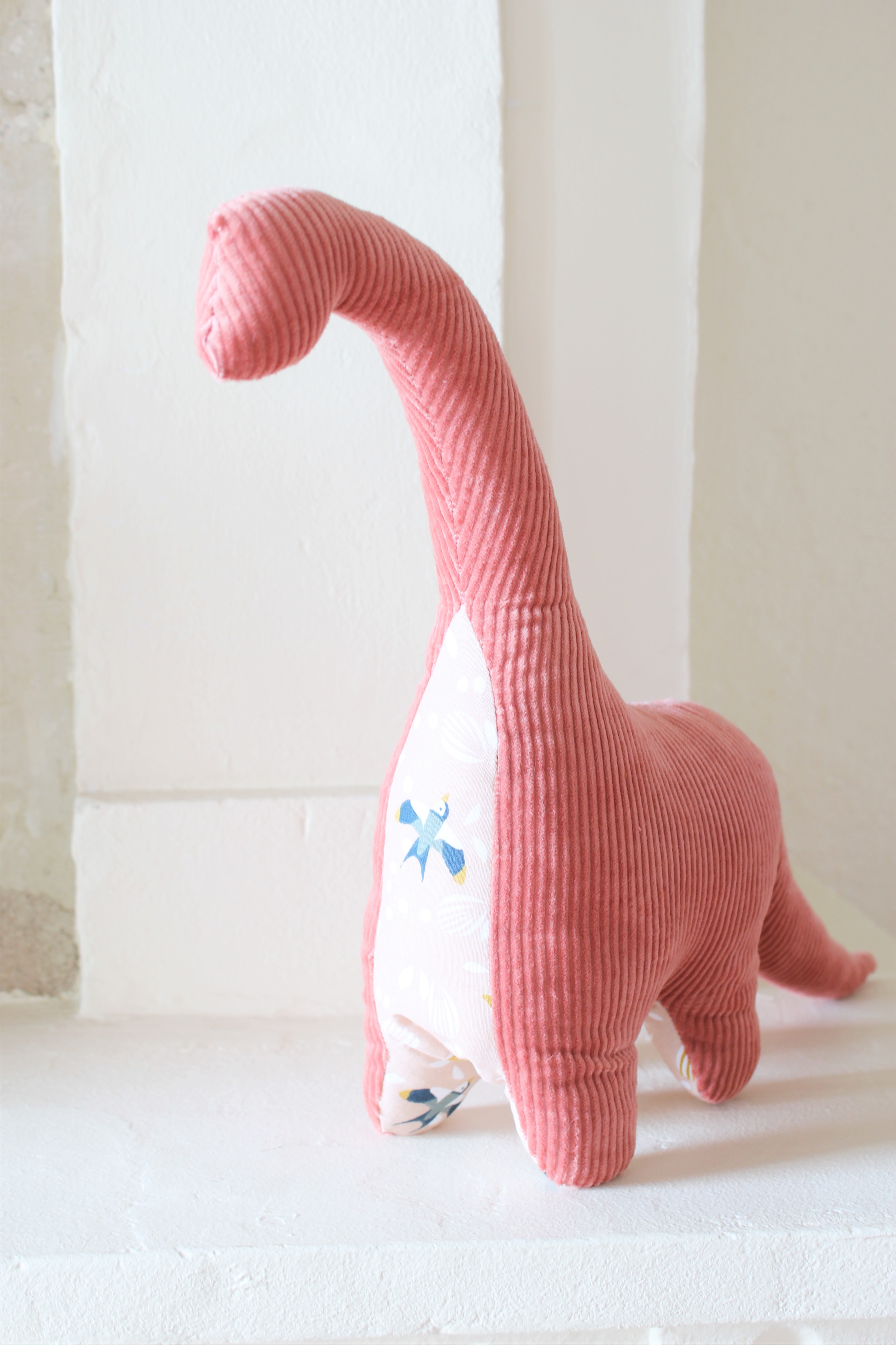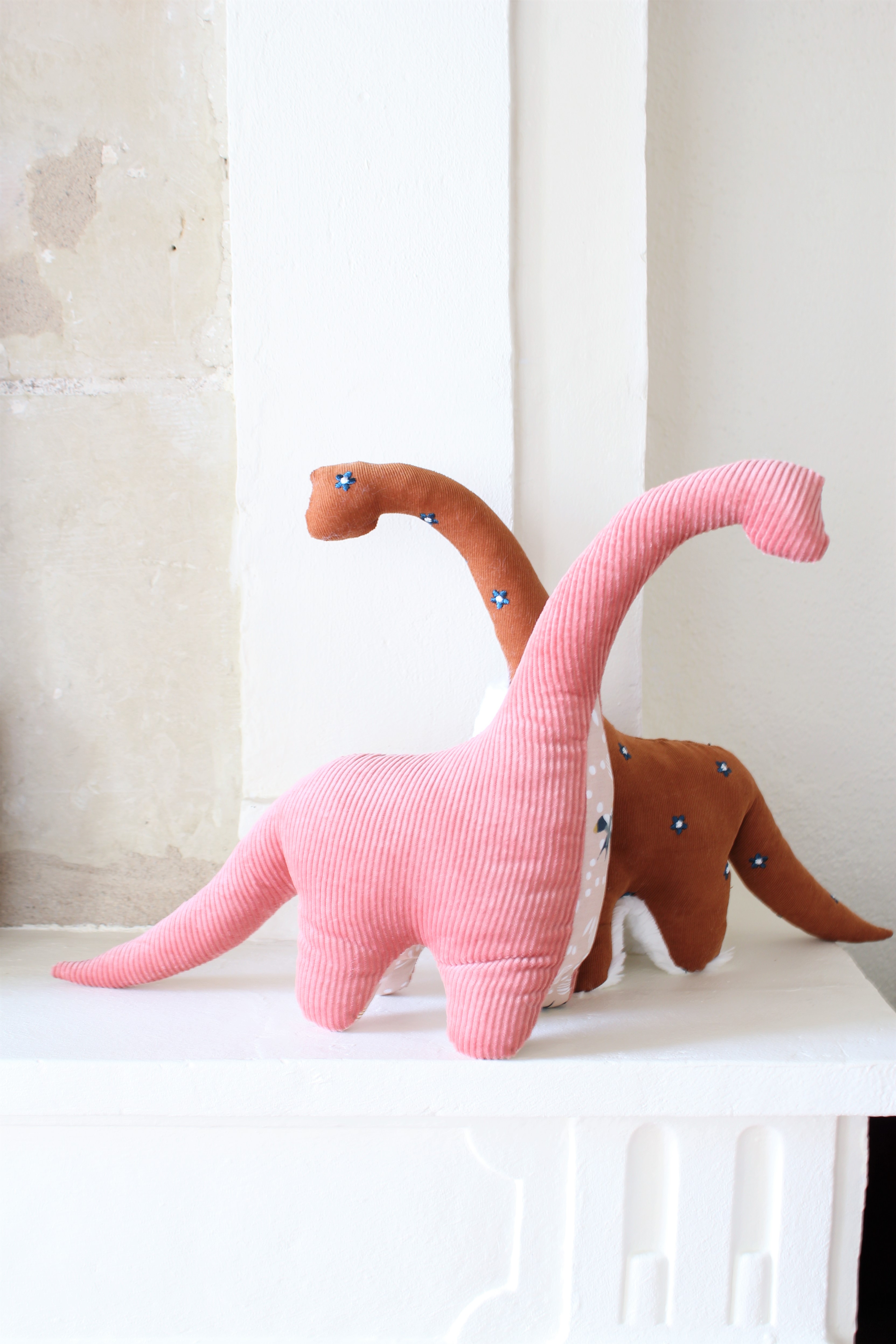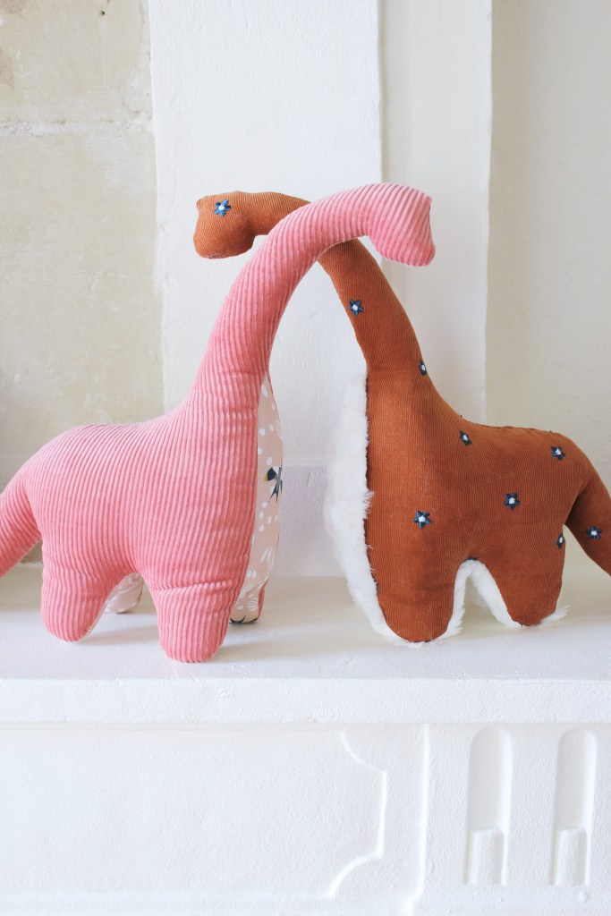 Aujourd’hui il s’agit d’un doudou, le diplodocus ! Je l’ai voulu dans la droite ligne du doudou éléphant qui plait tant : un patron aux jolies courbes, rapide à prendre en main et à confectionner. Ce diplo est cependant plus grand que son copain l’éléphant avec une envergure de 50 cm et une hauteur d’environ 28 cm. De quoi câliner, jouer, rêver EN PLUS GRAND !