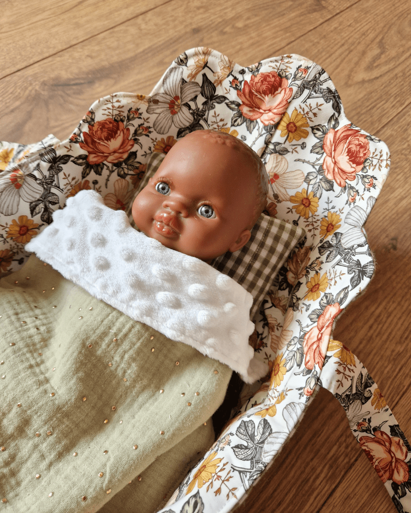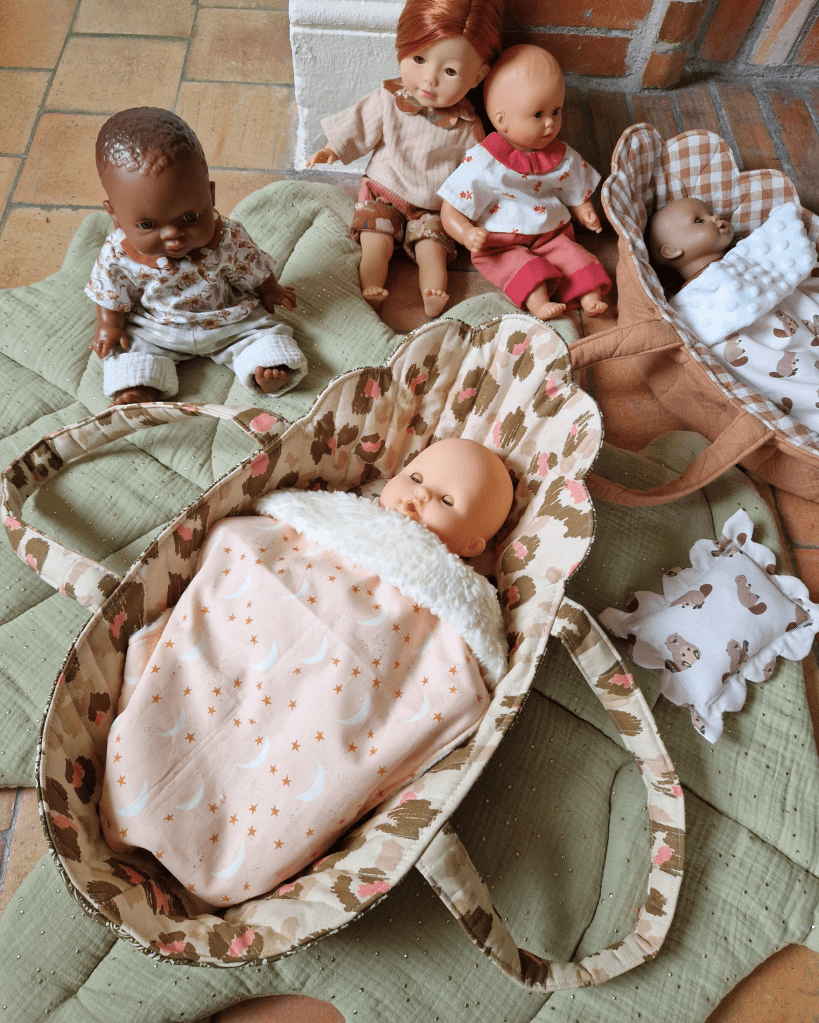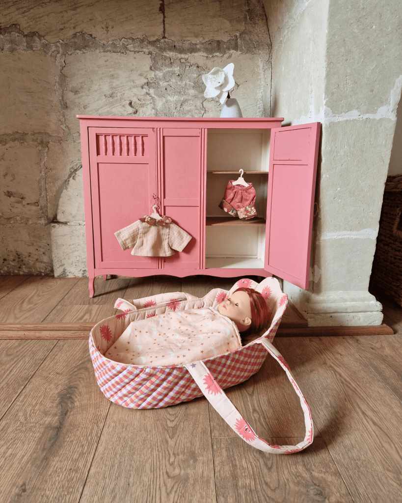 Le couffin se décline en deux tailles : une petite pour les poupées et poupons 30 cm de long, et une grande pour les poupées d’une longueur supérieure à 30 cm et jusqu’à 36 cm.