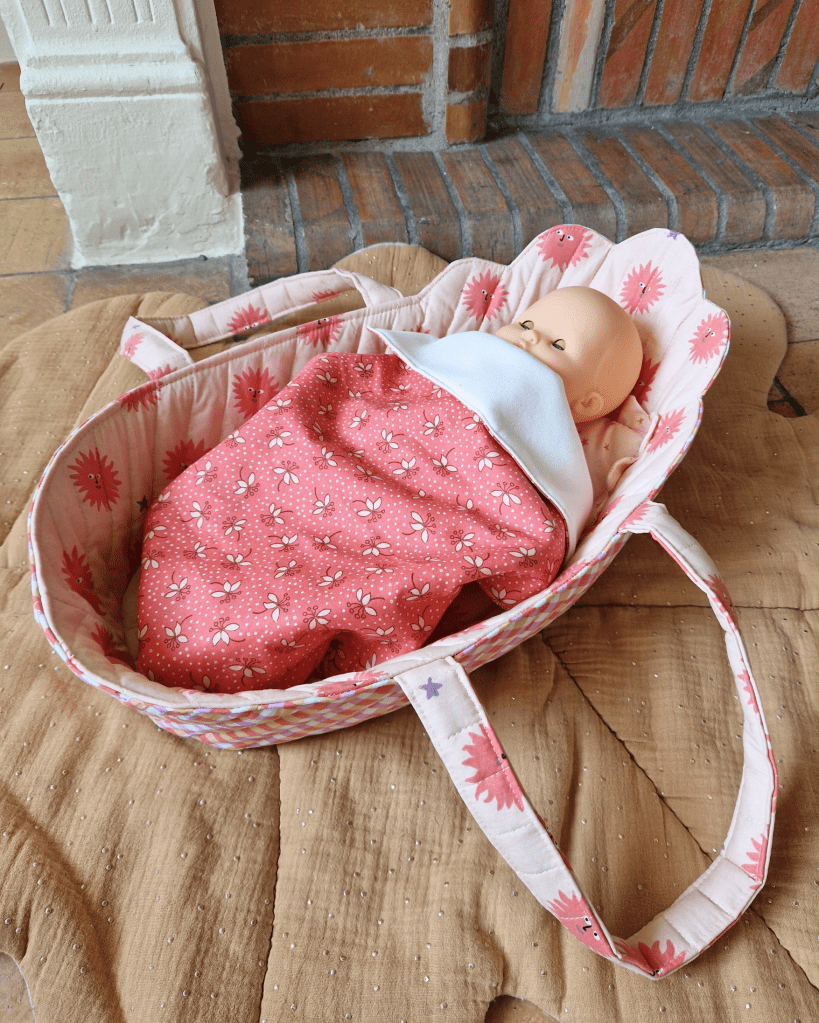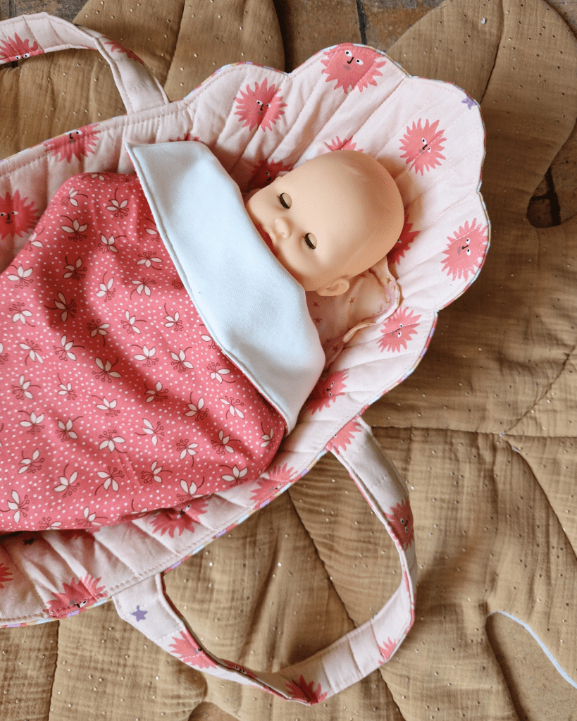 Ce patron, très facile à coudre, ne nécessite qu’un niveau débutant en couture et se compose d’un oreiller festonné, une couverture et un couffin. Malgré son accessibilité, ce patron présente de jolis détails originaux, notamment sa forme de coquille.