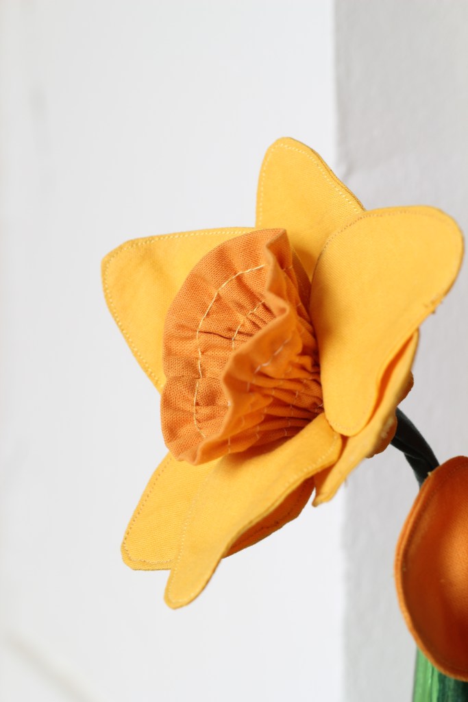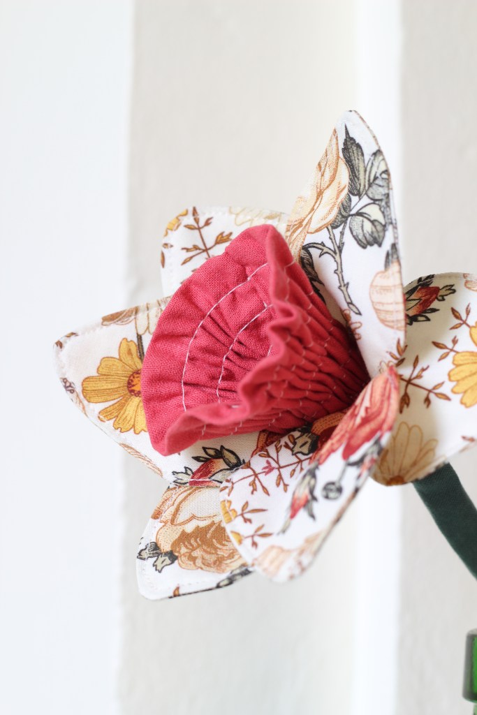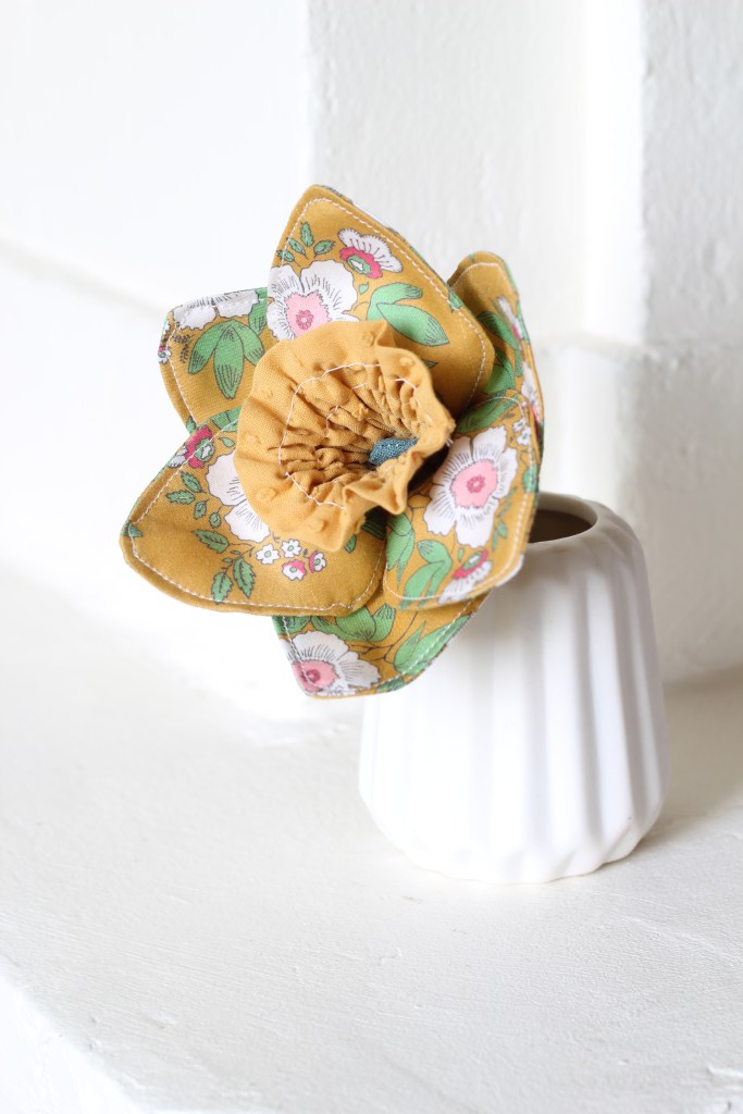 C’est un petit projet rapide à coudre, parfait pour utiliser toutes vos chutes de tissus lumineux. La corole centrale est obtenue en réalisant une série de fronces, pas compliquée et très bien expliquée dans la pas à pas fourni avec le patron, mais à cause de cette étape un peu plus minutieuse, j’ai opté pour une indication de difficulté 2/3, histoire de ne prendre personne par surprise.